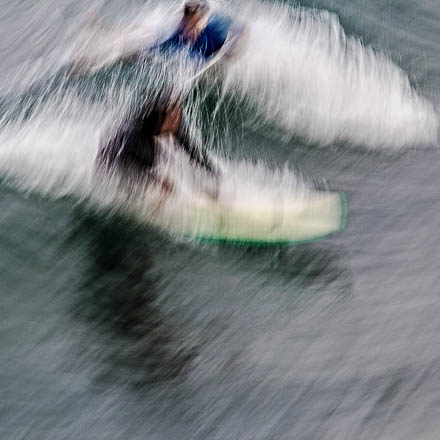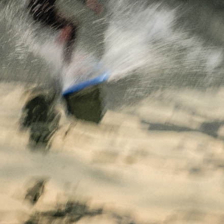 Moore marries digital photography and gestural abstraction to reduce surfers, seascapes, sunsets, and sea birds to their constituent parts—and presents them for reinterpretation. Wielding the camera with physical gestures, she visually deconstructs her Southern California environs into color, contrast, shape, and motion—with varying degrees of abstraction. Present to the spectacle of life around her, she waits and watches. The spectacle is her palette, the camera her brush. Through Moore’s approach, perception and purpose are altered. Physical objects are transformed into smears of photographic paint. Bits of reflected light are used as implements, carving surface textures into the photographic image as she waves her camera. While time and place play leading roles in her oeuvre, chance is the all-important supporting actor. The gestures of the artist’s hand converge with the movement of her subjects, in a transformative kinetic fusion.